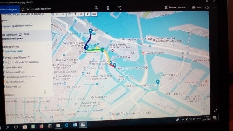 De route begon bij het Centraal Station, daar vertelde Younes een prachtig verhaal over het ontstaan van het Centraal Station. Daarna liep de groep door naar de metro ingang. Waarna Adil ook een verhaal vertelde, alleen dan over de Noord/Zuidlijn. We liepen toen naar de Schreierstoren via de linkerkant van het stations plein. Waar Max informatie gaf over de toren. Een paar minuten later kwamen we aan bij de Prins Hendrikkade 131, het huis van Michiel de Ruyter. Daar werd de tweede presentatie van Max gegeven. De een na laatste bestemming was het Scheepvaarthuis. Hier werd de presentatie gehouden door Ytse, hij vertelde vooral over de bouw van het huis. Voor de laatste bestemming waren we aangekomen bij het Scheepvaartmuseum (de oorspronkelijke naam was ’s Lands Zeemagazijn). Douwe gaf hier zijn presentatie over het ‘s Lands Zeemagazijn.